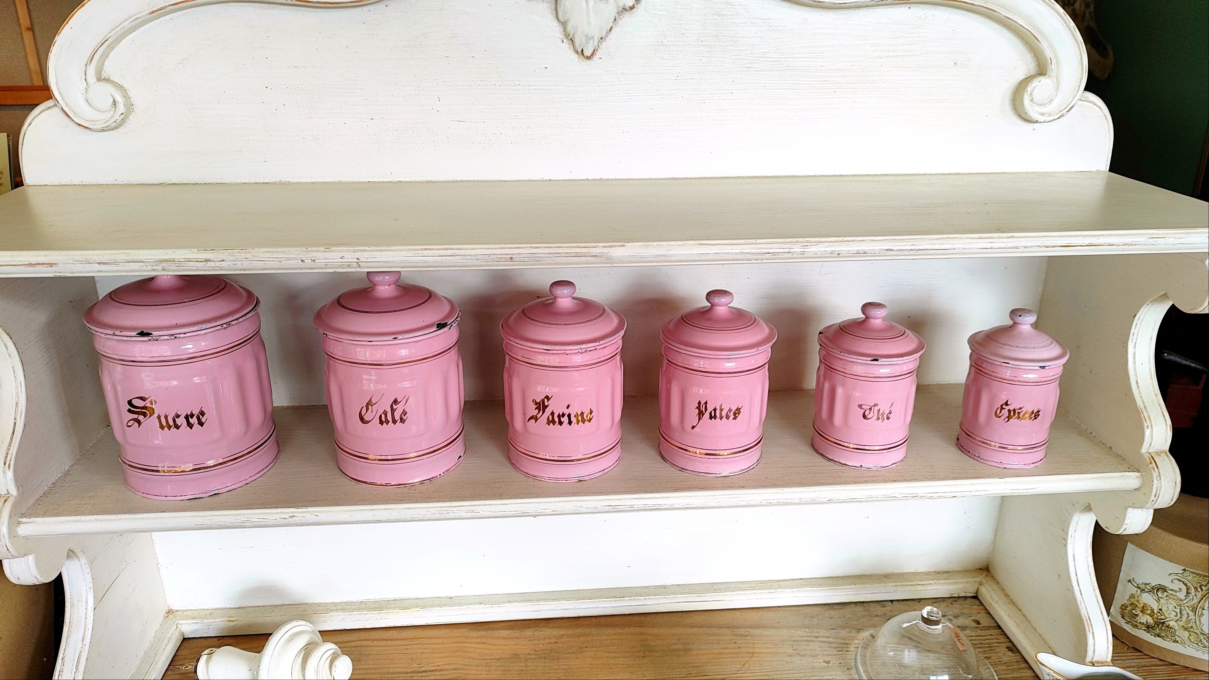 Pots émaillés très rares de couleur rose. Plusieurs dimensions.