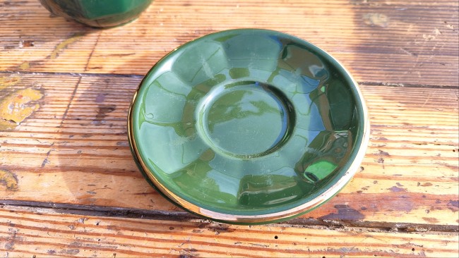 Grande tasse bistrot avec sa sous-tasse liseré doré. Traces du temps sur la sous-tasse.